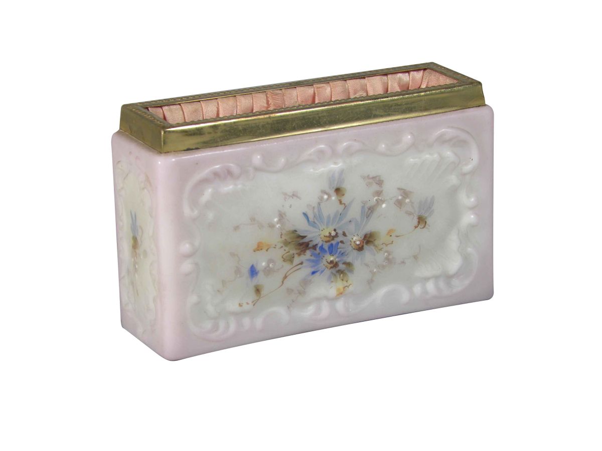 Wave Crest Photo/Letter Holder. Marked with Wave Crest Hallmark. Pink floral with original silk lining and metal rim. No chips or cracks, excellent condition. 4 1/8 X 2 1/2 X 1 3/8 inches.