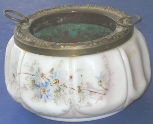 Very rare Wave Crest plant holder. Desirable and hard to find, small size w/ orig brass insert w/ pull rings. Hand painted white & pink floral. 3"x4" aprox. 2lbs. (5-187)