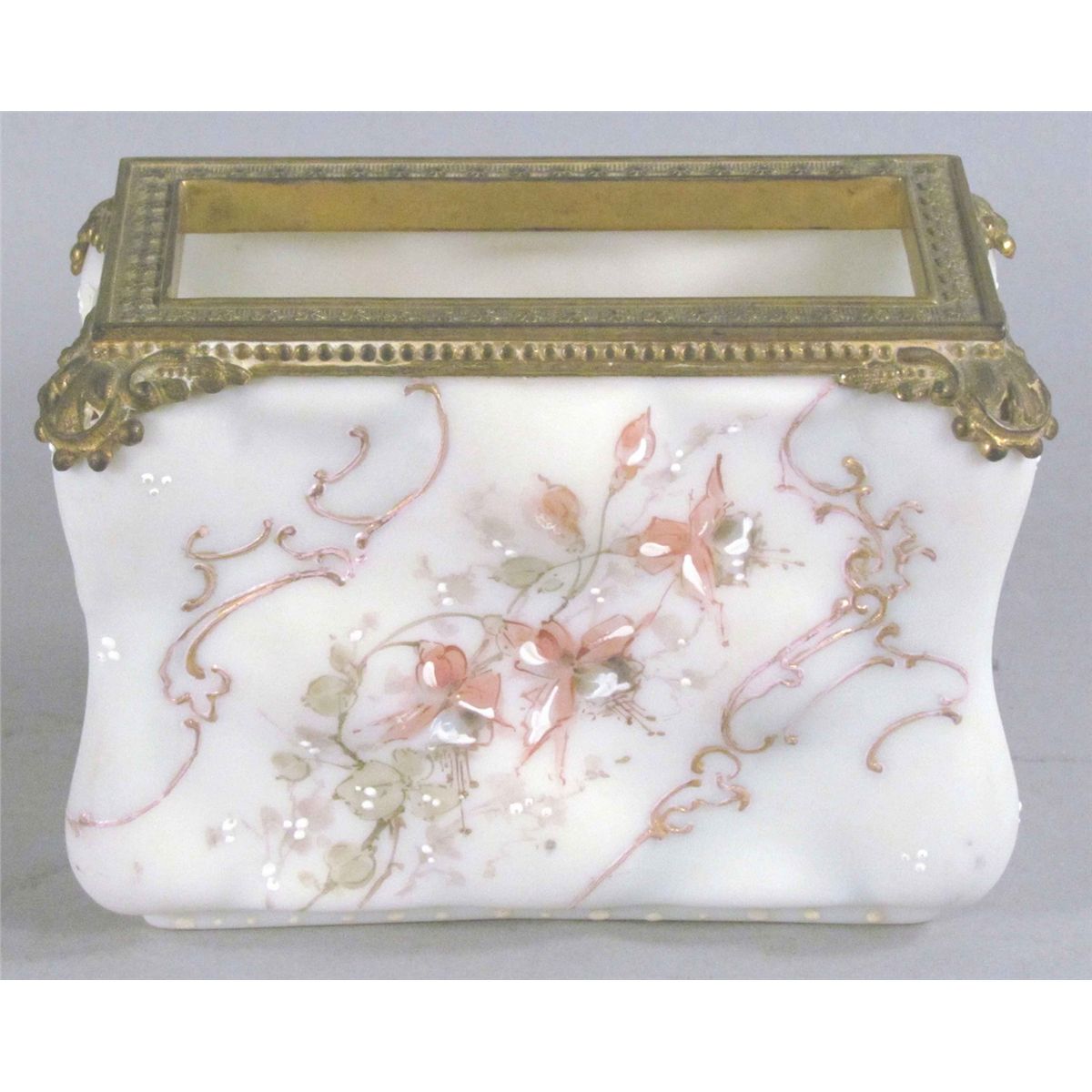 Wave Crest Post Card Holder. Egg crate design with pink enameled floral motif and metal frame on opening. Unmarked, no chips or cracks. 4 X 3 inches. Start Price $50