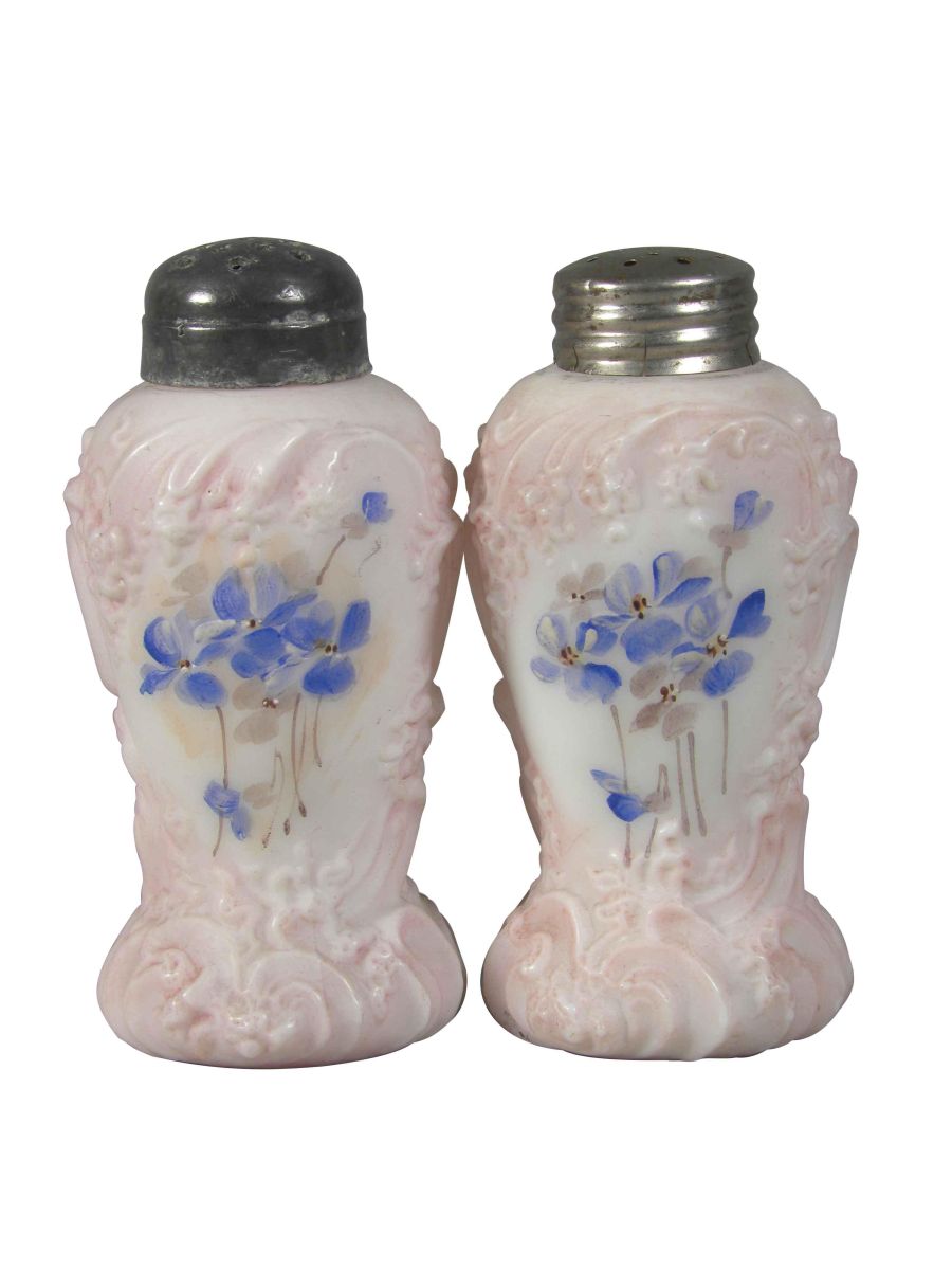 Wave Crest Salt/Pepper Shaker, unmarked. Pink w/ blue flowers. Mismatched lids. No chips or cracks, excellent condition. 3 1/2 inches tall.