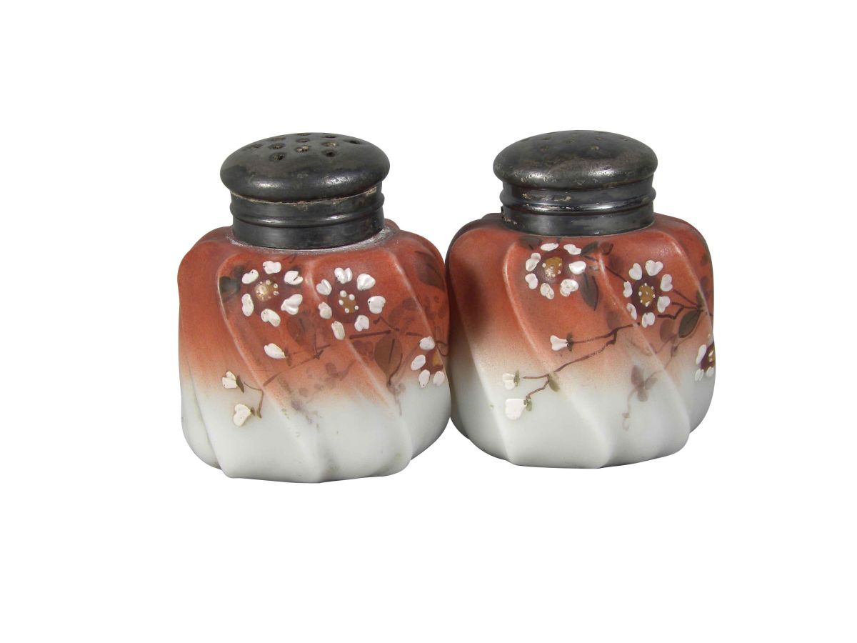 Wave Crest Salt/Pepper Shaker. Original paper label on one. Coral w/white flowers. No chips or cracks, excellent condition. 2 X 2 1/4 X 2 inches each.