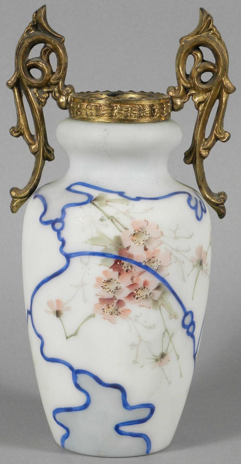 Wave Crest Small Ewer Vase with brass trim opening and handles. Unusual enamel outline on design. Marked Wave Crest on bottom. No chips or cracks. 8 inches tall. Start Price $100