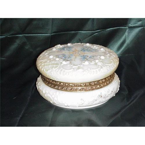 Wave Crest box 7 1/4" in diameter 3 3/4" tall. Hand painted floral decoration and brass hinged ring. Fabric liner missing. After 1898, Good to Excellent condition.