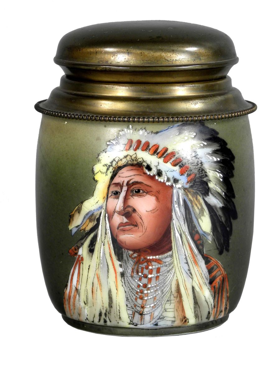 Wave crest Nakara Tobacco Humidor. Marked, The CFM Company. Depicting native American Indian chief. No chips or cracks, small dent in lid otherwise excellent condition. 5 1/2 inches tall.