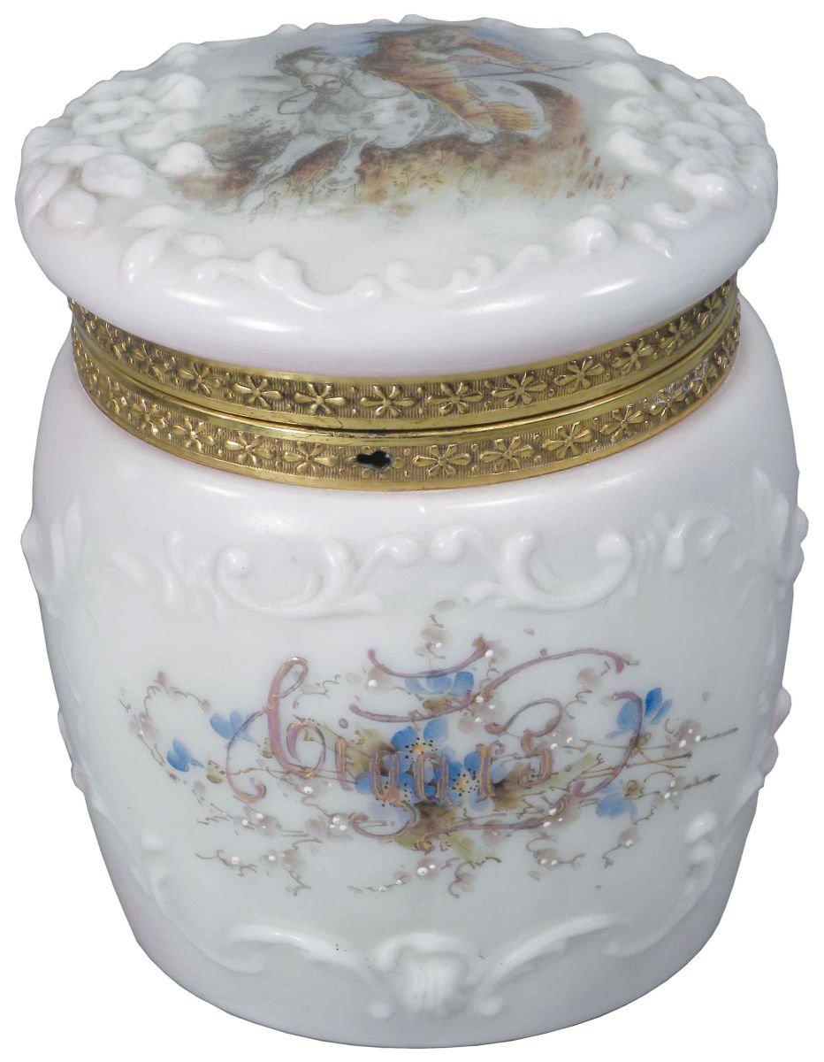 Wavecrest Cigar Humidor with Native American motif. No chips or cracks, unmarked but original illegible sticker on bottom, no key. 6 inches tall X 5 1/2 inch diameter. Start Price $200