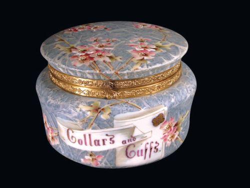 Wavecrest Wave Crest Collar/Cuffs Dresser Box, Extremely Rare. Pictures of collars and cuffs on front, blue water mark background with pink flowers. In my opinion this is one of the most beautiful pieces produced by Wave Crest. Marked Kelva, no chips or cracks. 5 1/2 inches tall X 8 inch dia.