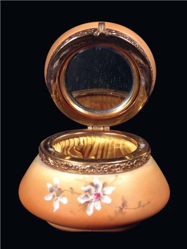 Wavecrest Wave CrestDresser Box w/Mirror, rare brown color, floral pattern, beaded top. Mirror tilts forward and back, has satin lining. Marked Nakara, C.F.M. Co., no chips or cracks. 3 1/2 inches tall X 5 inch dia.