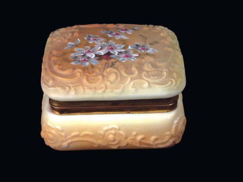 Wavecrest Wave CrestDresser Box, rare brown color, floral pattern. Marked Nakara, C.F.M. Co. on bottom. Note taped to bottom, Made around 1880-1890, came to me through my family having belonged to Aunt Meta Carby, deceased, signed Alma Balko-Fisher. No chips or cracks. 6 X 4 X 5 1/4 inches.