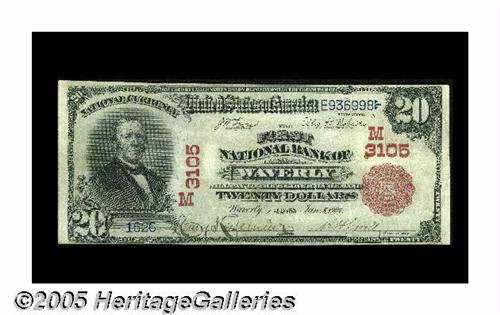<B>Waverly, IA</B></I> - $20 1902 Red Seal Fr. 639 <B>The First NB</B></I> Ch. # (M)3105<BR>This is one of three Red Seals reported from this bank, and one of two twenties. It's a more than acceptable specimen, with sharp red color and strong pen signatures. <B>Fine-Very Fine.</B></I>