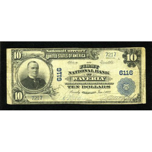 <B>Waverly, IL</B></I> - $10 1902 Plain Back Fr. 634 <B>The First NB</B></I> Ch. # 6116<BR> A more elusive signature combination is noticed on this 1922 dated example. <B>Fine</B></I>.<BR><BR><b>Shipping:</b> Coins & Currency (<a target="_blank" href="http://www.heritageauctions.com/common/shipping.php">view shipping information</a>)