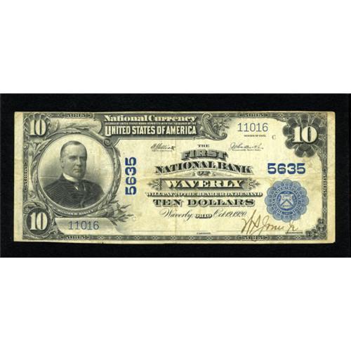 <B>Waverly, OH</B></I> - $10 1902 Plain Back Fr. 633 <B>The First NB</B></I> Ch. # 5635<BR> The president's signature is bold, though the treasurer's faded some time ago. The overprint remains deep. <B>Fine.</B></I><BR><BR><b>Shipping:</b> Coins & Currency (<a target="_blank" href="http://www.heritageauctions.com/common/shipping.php">view shipping information</a>)