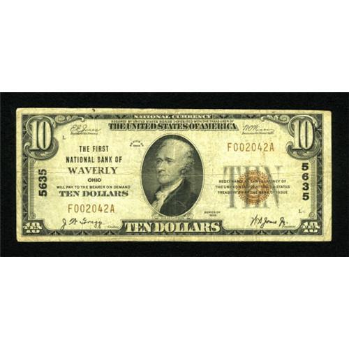 <B>Waverly, OH</B></I> - $10 1929 Ty. 1 <B>The First NB</B></I> Ch. # 5635<BR> The paper is undisturbed on this Pike County issue. <B>Fine.</B></I><BR><BR><b>Shipping:</b> Coins & Currency (<a target="_blank" href="http://www.heritageauctions.com/common/shipping.php">view shipping information</a>)