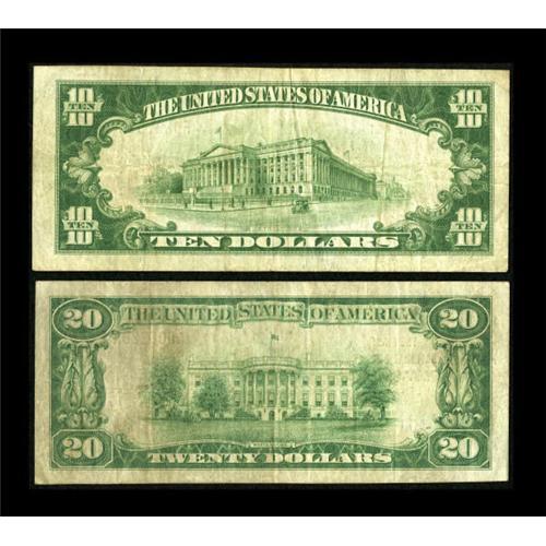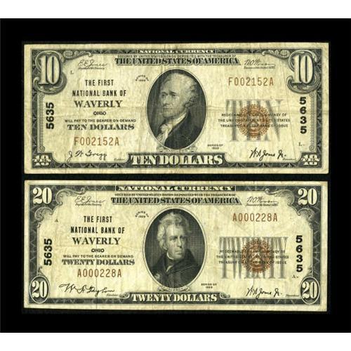 <B>A Well Matched Waverly, OH Pair</B></I><BR> $10 1929 Ty. 1 <B>The First NB</B></I> Ch. # 5635,<BR>and a $20 1929 Ty. 1 <B>The First NB </B></I>Ch. #5635.<BR>Both notes grade <B>Very Fine </B></I>with the $10 displaying J.W Gregg's signature as cashier and the $20 with W.F. Taylor's signature as cashier.<BR><BR><b>Shipping:</b> Coins & Currency (<a target="_blank" href="http://www.heritageauctions.com/common/shipping.php">view shipping information</a>)