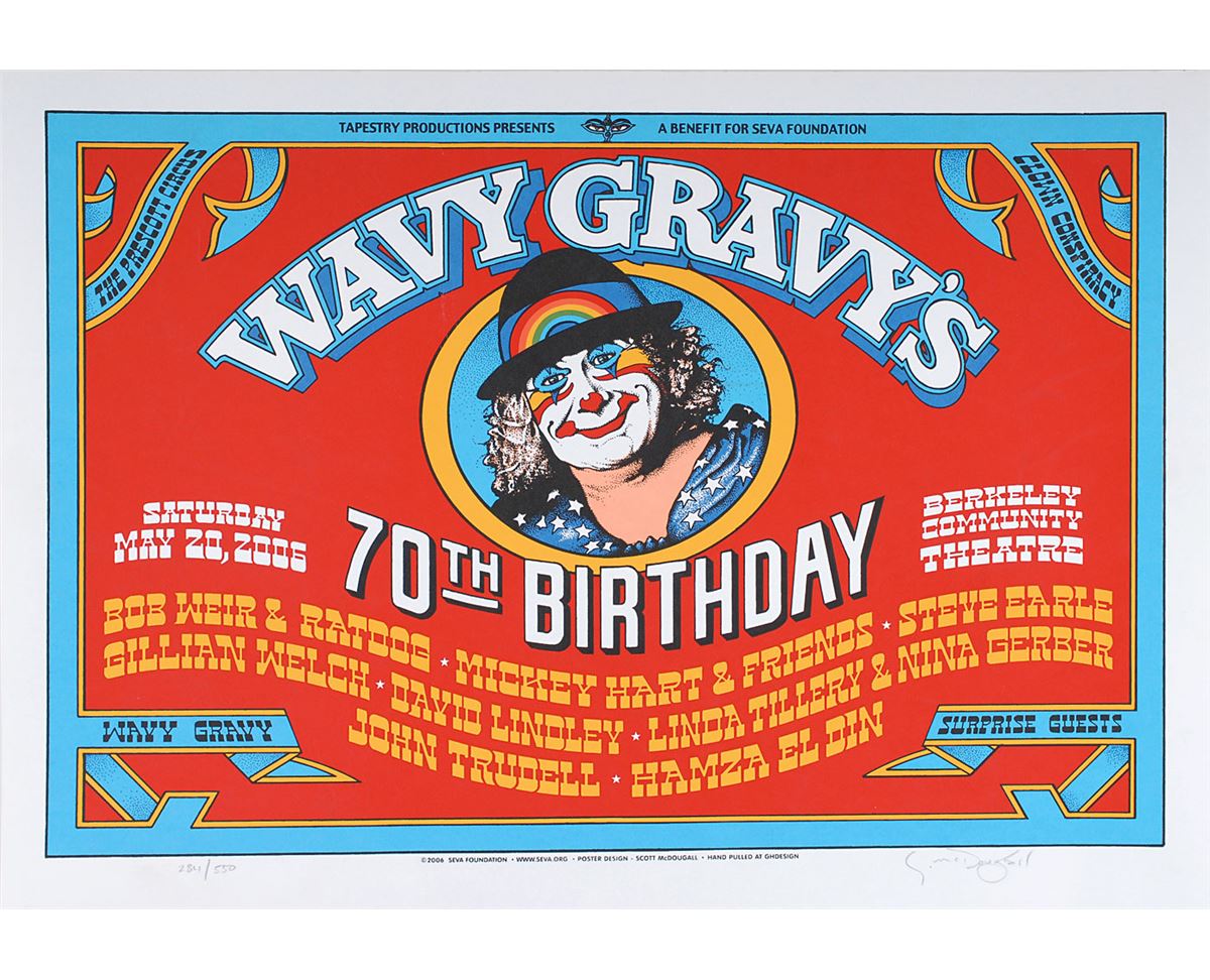 Color limited edition 22.75 x 16.25 poster honoring Wavy Gravy’s 70th Birthday, numbered 284/550, signed in pencil by the artist, Scott McDougall. In fine condition.
