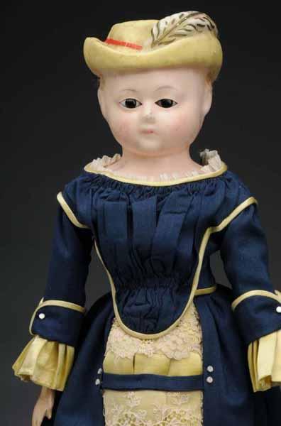 Description Ca. 1880. Papier-mache shoulder head with molded yellow hat with feather, dark pupilless glass eyes, closed mouth (a few face scratches and nose bump, but no cracks). Original shapely cloth body with wood lower arms and legs. Redressed in navy wool and lime green satin, vintage underwear. Condition (Excellent). Size 23" T.