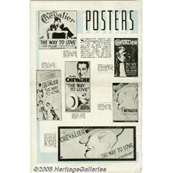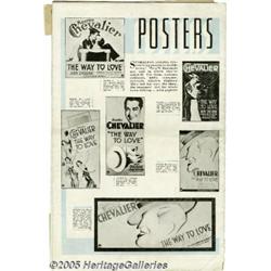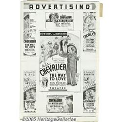 <B>Way to Love (Paramount, 1933)</B></I> Pressbook (Multiple Pages). After Sylvia Sydney walked off the film and Carole Lombard turned the film down, Ann Dvorak took the role as the romantic interest for Maurice Chevalier in this love story from Paramount. The film is the light-hearted tale of a man who wants to be a tour guide for Parisienne lovers but ends up falling for a circus girl with lots of troubles. This pressbook has publicity pages and an additional ad supplement inside. The cover shows wear along the spine and corner creasing as well as evidence of being folded in half at one time. The cover also has a hole in it which goes through Chevalier's hat and into the first two pages of the book. There is also one detached publicity page with two major cuts on it. Other than this, the pressbook would grade in very good condition. Good.