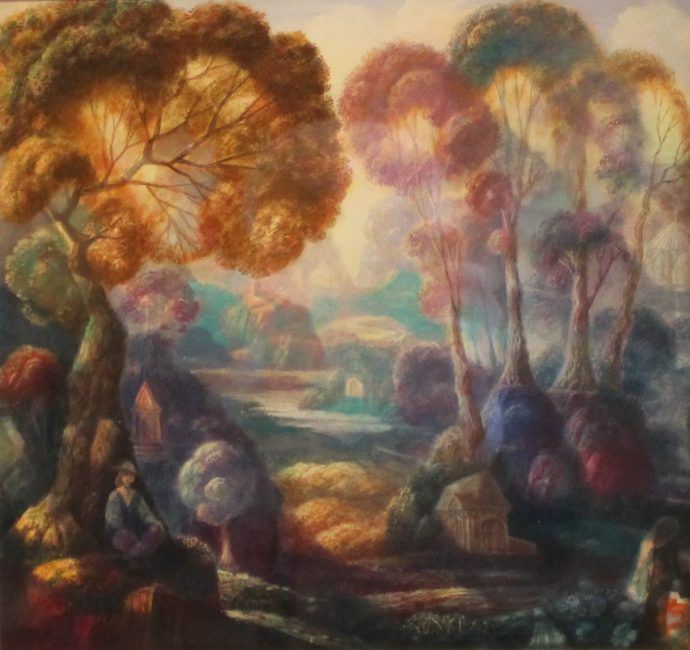 Wayfarer by Harold Hitchcock shows a women sitting underneathe colorful trees with small houses. This piece is a framed original watercolor with the size of 21" x 21 1/2".