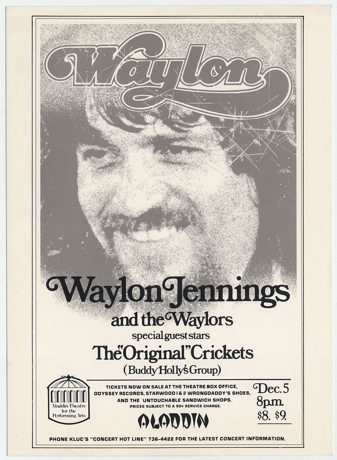 WAYLON JENNINGS and the Waylors, The Original Crickets (Buddy Holly's Band) appearing December 5, 1977 at the Aladdin Theatre for the Performing Arts at the Aladdin Hotel in Las Vegas, Nevada.