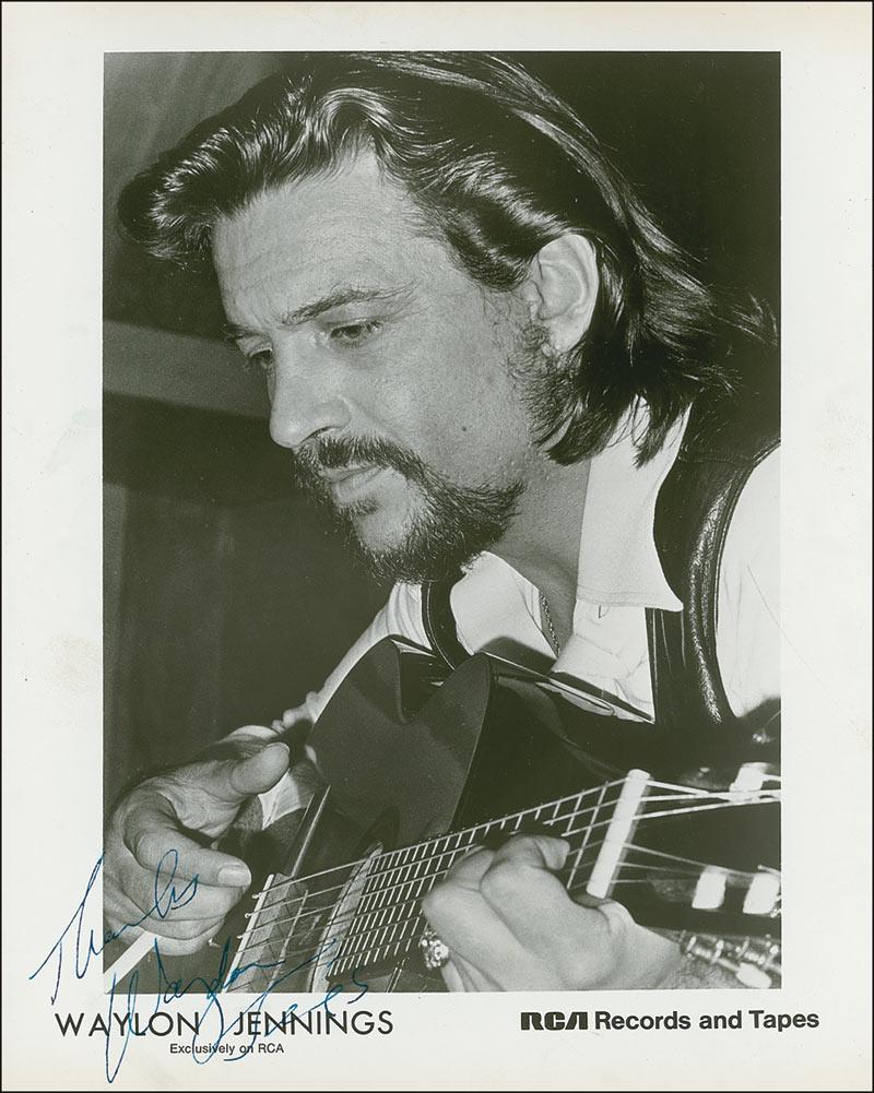 Early glossy 8 x 10 RCA Records publicity photo, signed in blue ink, “Thanks, Waylon Jennings.” In fine condition, with some light toning to edges, a few light creases and surface marks, and a bit of irregular adhesion to signature.