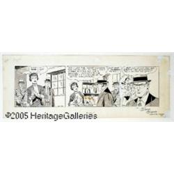 <B>Wayne Boring - Superman Daily Comic Strip Original Art, dated 10-26-64 (Bell McClure Syndicate, 1964).</B></I> This '60s <I>Superman</B></I> daily has many of the hallmark Wayne Boring touches: Lois Lane dressed to the nines, Clark Kent sporting his super-conservative suit, snap-brim hat, and thick horn-rimmed glasses, and Superman standing proud, flexing his thick, powerful, barrel-chested torso! Scowling tommy-gun welding underworld gangsters complete the dramatic tableau. The image area of the daily measures 5" x 17", and the art has been signed and dated in the lower, left corner. The art is in Excellent condition. <I>From the collection of Richard and Wendy Pini. Richard says: "Some artists are forever associated with certain characters. For me, reading DC comics in the late 1950s, there was only one Superman artist, and that was Wayne Boring (even though I had no idea who he was at the time -- I was all of 8 years old). Comics historian Jim Steranko (probably with tongue in cheek) called Boring's style 'Egyptian' and it made perfect sense to me."</B></I>