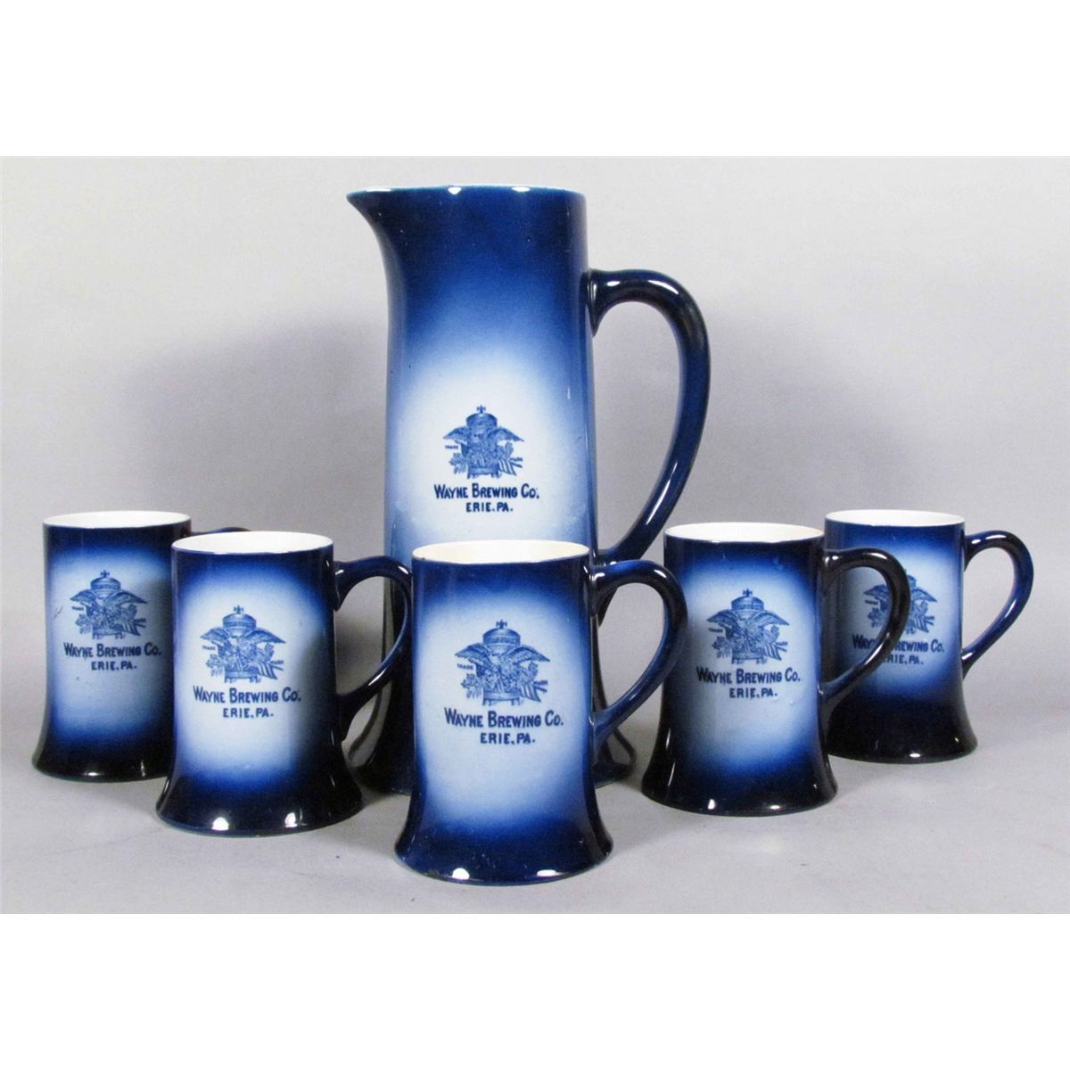 Wayne Brewing Co. Erie, PA Pitcher & Mug Set. Thos Maddock's Son's Co. Fenton, NJ. Pitcher and 5 mugs, only one tiny chip in one mug otherwise excellent condition. Pitcher measures 12 inches tall. Start Price $100