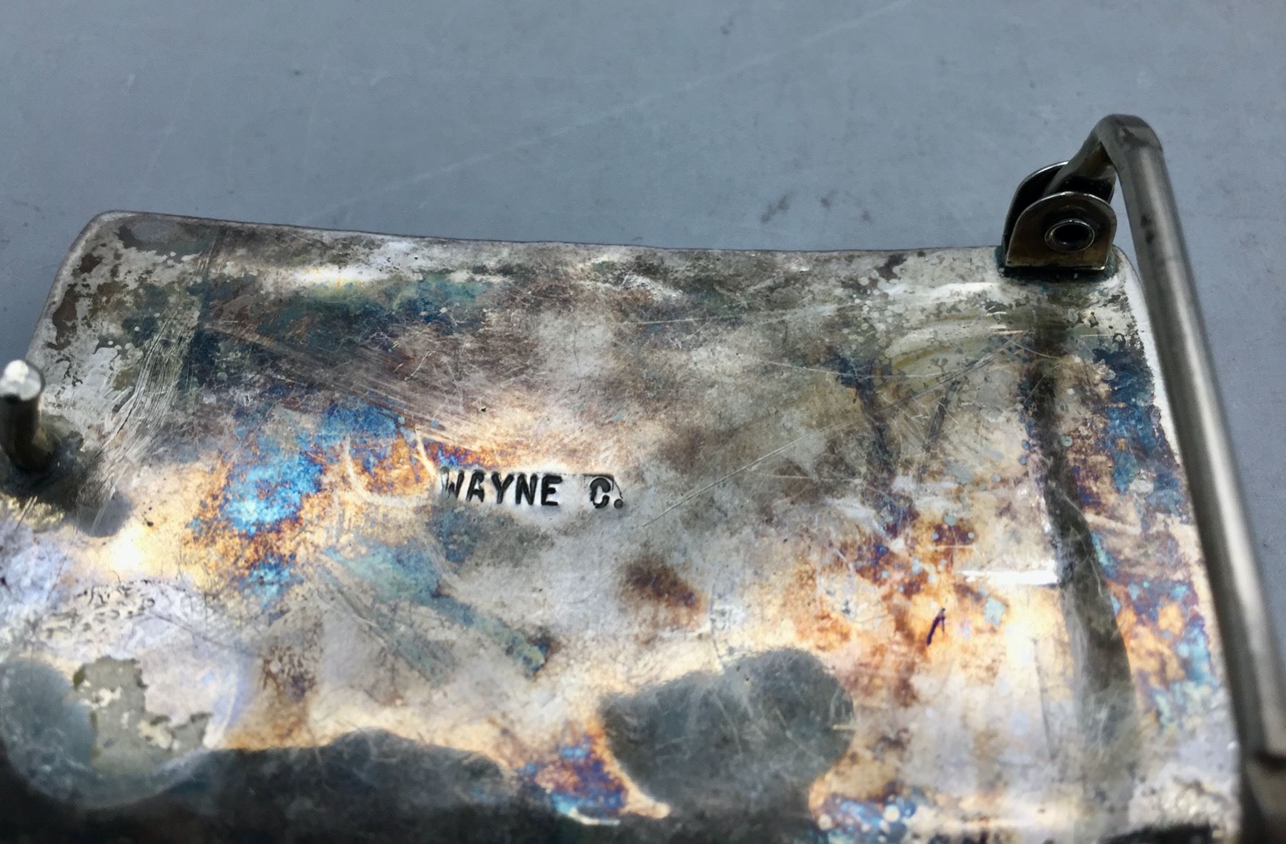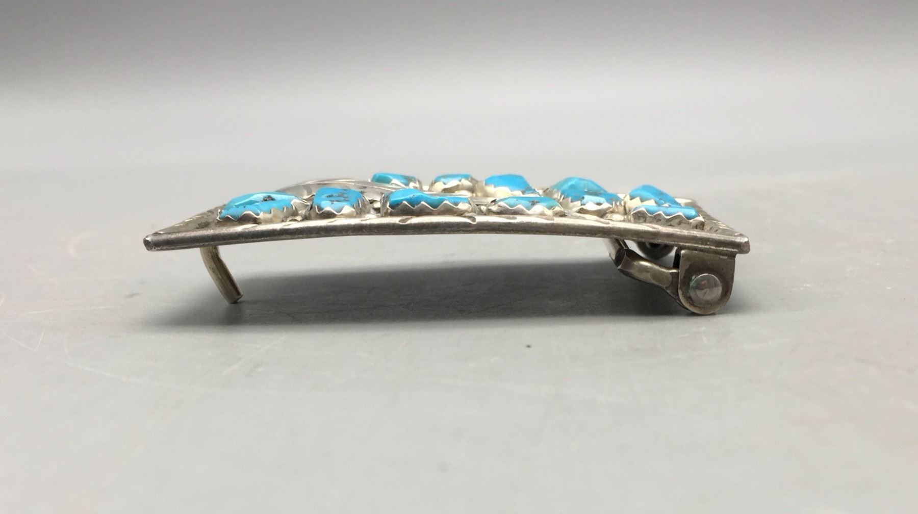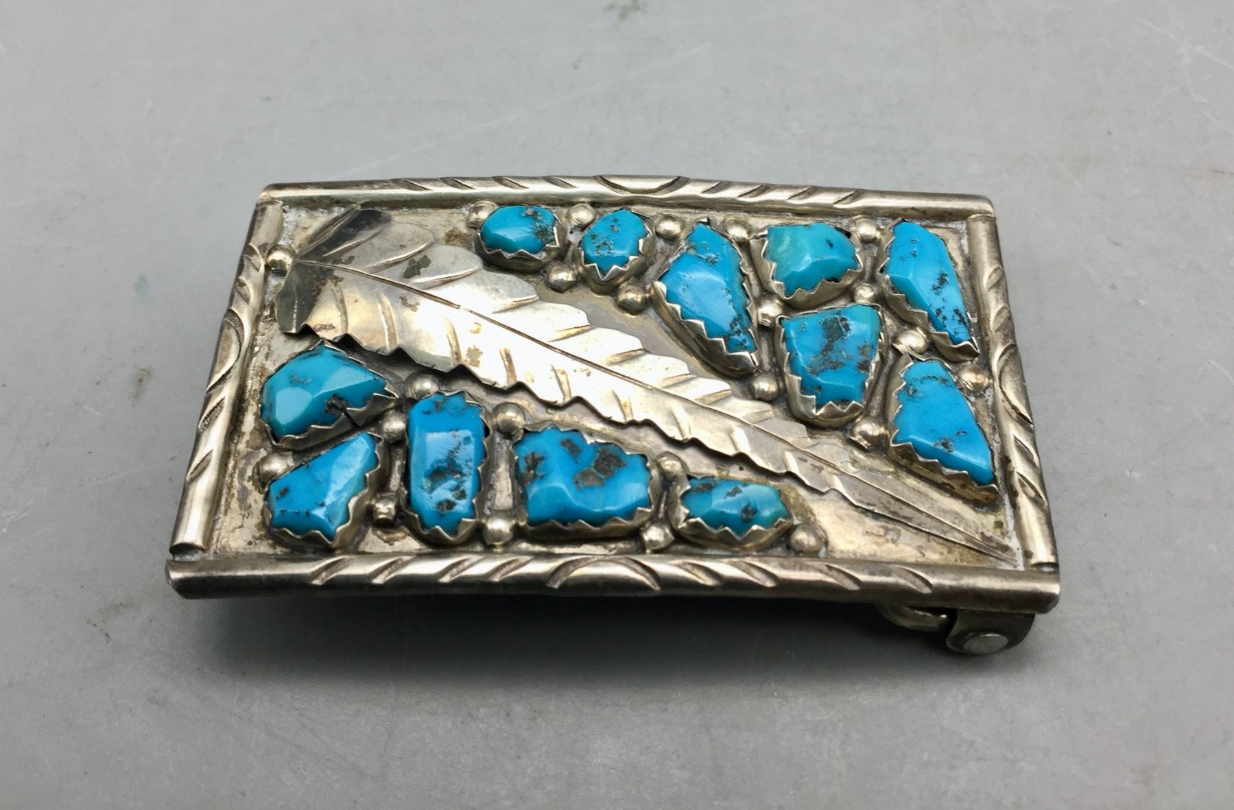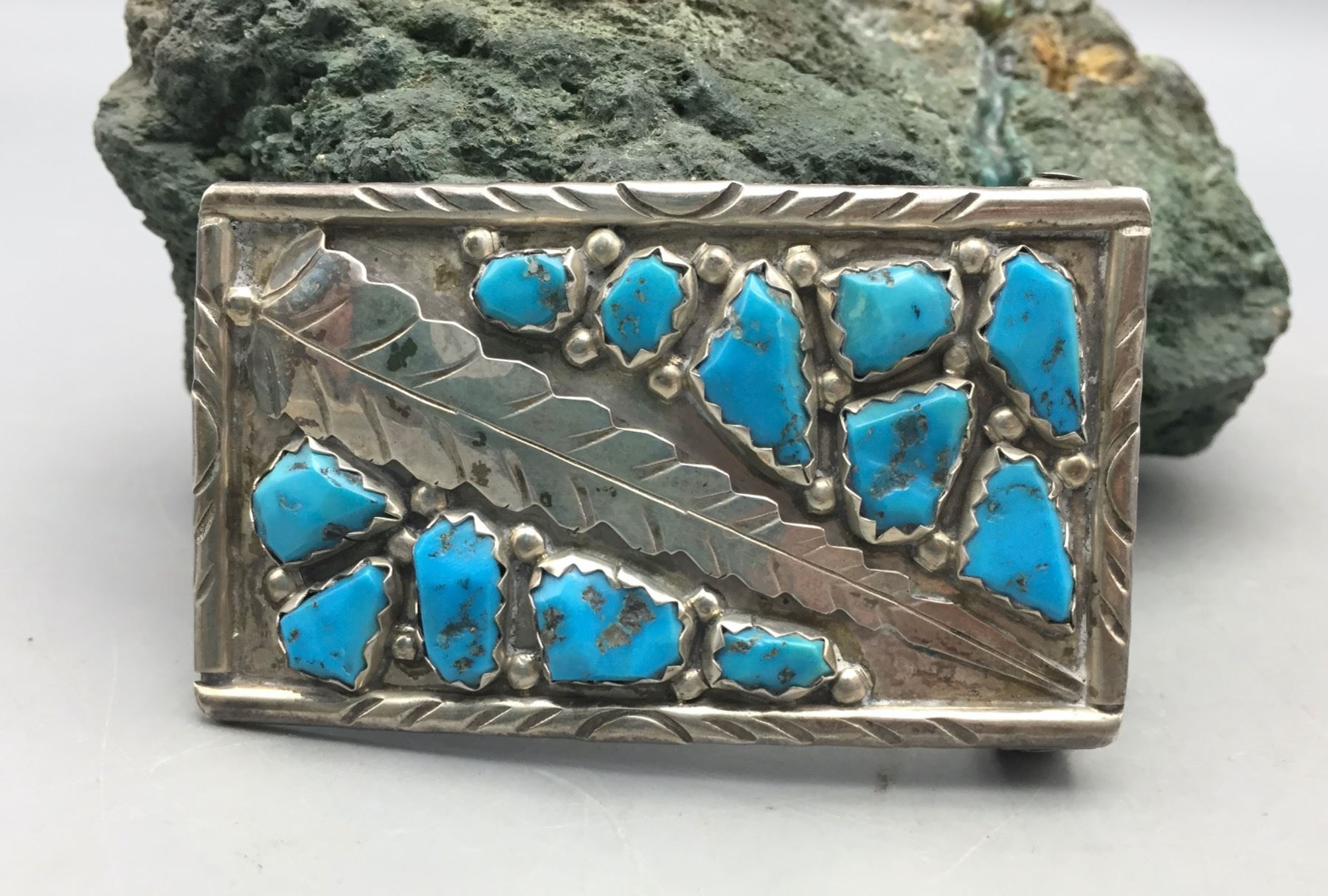 Description: Offered for sale in this lot is a beautiful Zuni made belt buckle set with twelve turquoise stones which are accented with sterling silver leaf appliqué. It is sterling silver. Maker: Wayne Cheama, Zuni. Approx. Age: Vintage. Size: Measures 3 inches wide x 1-3/4 inches tall. Fits a 1-1/2 inches belt. Weighs 34.7 grams. Condition: Good for its age, normal wear expected. Please look closely at the pictures - they are an important part of our description. Shipping: There will be a $5 handling, packaging fee for shipping this lot. The actual cost of postage will be added on top of that.