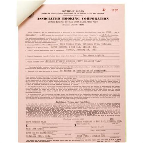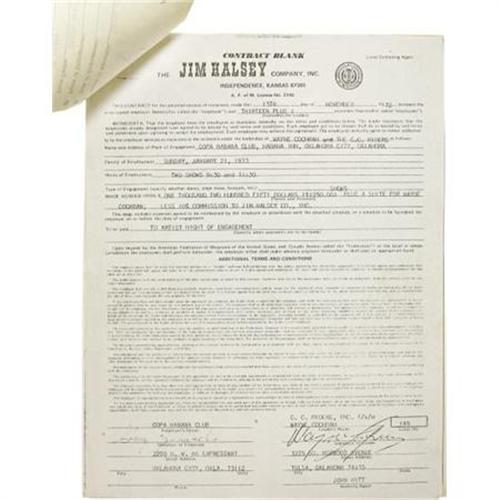 <B>Wayne Cochran Contract.</B></I> A booking contract dated November 13, 1972, engaging Cochran for a show at the Copa Habana Club. Unsigned, in Very Fine to Excellent condition. <I>From the Tony Papa Archives</B></I>. <BR><BR><b>Shipping:</b> Flat Material, Small (<a target="_blank" href="http://www.heritageauctions.com/common/shipping.php">view shipping information</a>)