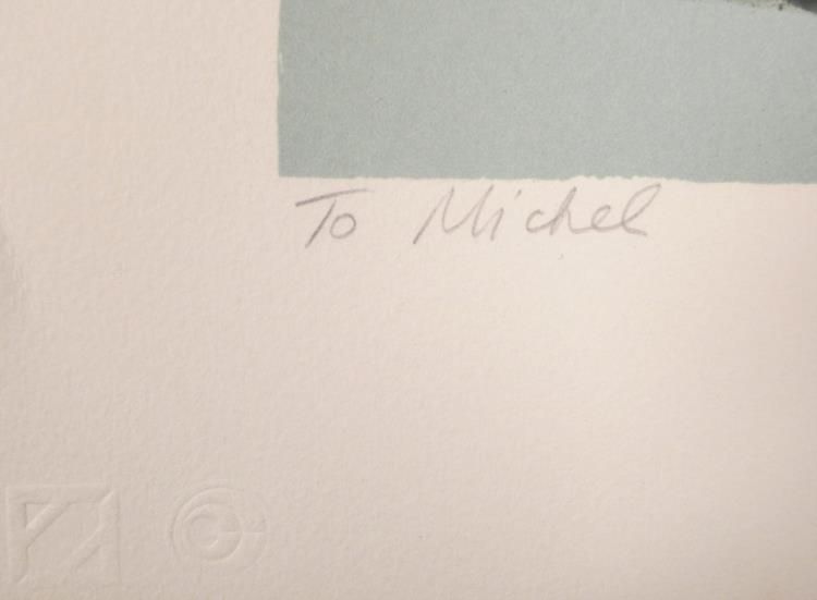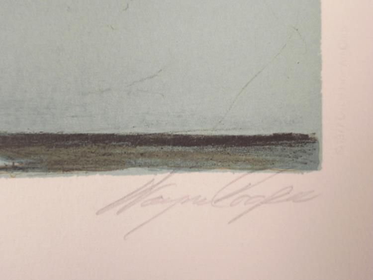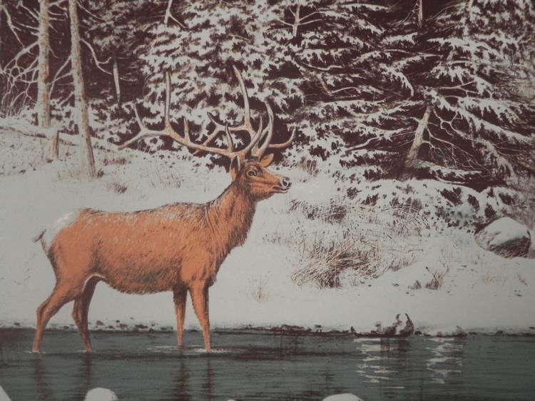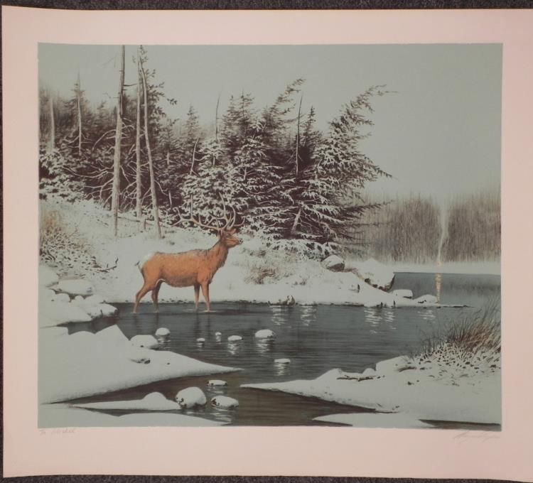 A buck stands out against the azure tone winter forest landscape in this lovely nature print. * * * Artist: Wayne Cooper * Signature: In pencil, lower right * Medium: Lithograph on rag paper * Edition: Unnumbered, dedicated artist proof, marked "To Michel" in pencil, lower left * Publisher: Circle Gallery * Markings: Publisher's blind stamp, lower left * Sheet size: 27 1/2 x 24 inches * Condition: Excellent; minor corner crease, lower left margin corner * * * Biography: * Wayne Cooper (1942- ) was born in Oklahoma and became interested in art at an early age. He trained at the Cowboy Artist of America Museum in Kerrville, Texas, Gary Artist League, Valparaiso University, and American Atelier in New York City. He returned to Oklahoma to paint, and became recognized for his beautifully rendered images of the American West, and Native American people. His art can be found at the Will Rogers Museum in Claremore, Oklahoma; the Oklahoma Heritage Museum; and the American Indian Museum in Catoosa, Oklahoma, as well as many public and private collections throughout the world. * * * We are pleased to present from an estate a group of dedicated artist proofs. *