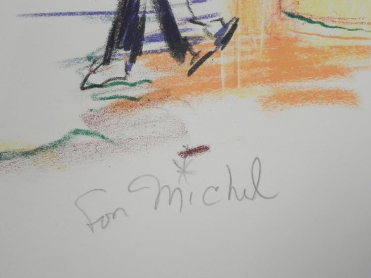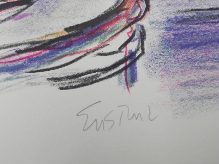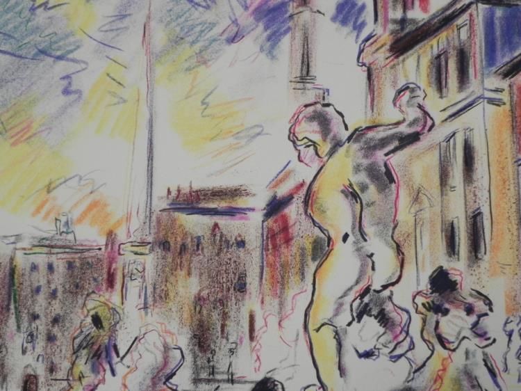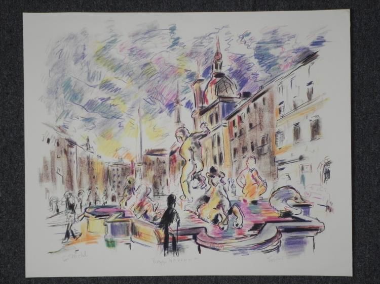 This view of the Italian village is from the sculptural fountain, looking toward the buildings under a pastel sky. * * * Artist: Wayne Ensrud * Signature: "Ensrud" in pencil, lower right * Title: Piazza Navonna * Medium: Lithograph on rag paper * Edition: Unnumbered, dedicated artist's proof, marked "For Michel" in pencil, lower left * Date: 1982 * Sheet size: 26 x 36 inches * Condition: Very Good; minor creasing, should flatten out * * * Biography: * Wayne Ensrud (1934 - ) received his BFA from the Minneapolis Institute of Art, where he met fellow artist Oskar Kokoschka, who became a great influence on his work. In 1975 Ensrud was invited as the first American painter to exhibit at the French Institute Gallery, N.YC. He became known in the world of fine wines for his pictures of Bordeaux and the vineyards. He has designed menus, posters, and advertising for many fine restaurants. He also worked as a free-lance art director and animator for major television networks, and taught art at Simon's Rock Early College. His commissioned work includes portraits of jazz legends Count Basie, and George Shearing, as well as a mural for the New York restaurant Larre. His art has appeared in numerous solo and group exhibitions in galleries and museums, and it can be found in selected public and private collections. * We are pleased to present from an estate a group of dedicated artist proofs. *