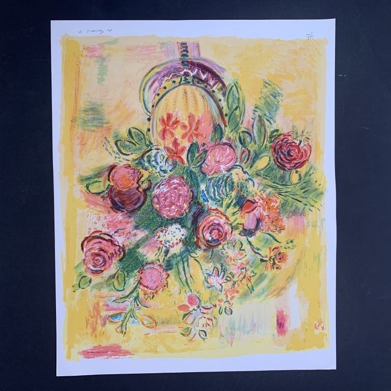 Wayne Ensrud's "Quiet Sunday" limited edition print, signed lower right and numbered 138/300 lower left. This piece is of a large bouquet of pink flowers in a base, against a yellow background. This piece is in near excellent condition with a very minor crease upper left corner.