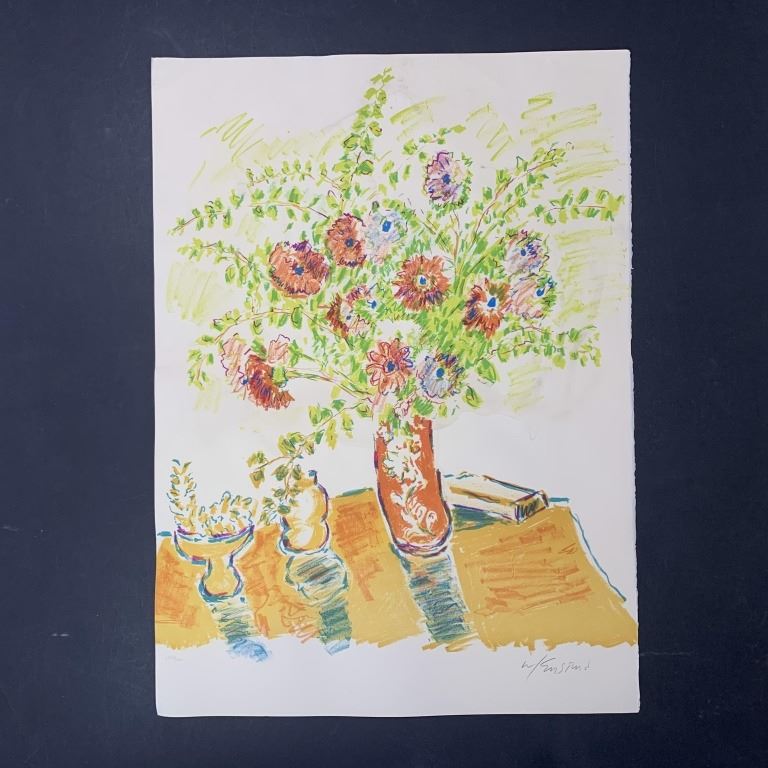 Wayne Ensurd's "Blue Bouquet" limited edition print, signed lower right and numbered 239/300 lower left. This piece is of a bouquet of flowers, resting on a table. This piece is in near excellent condition with minor wrinkles middle left, crease upper left corner.
