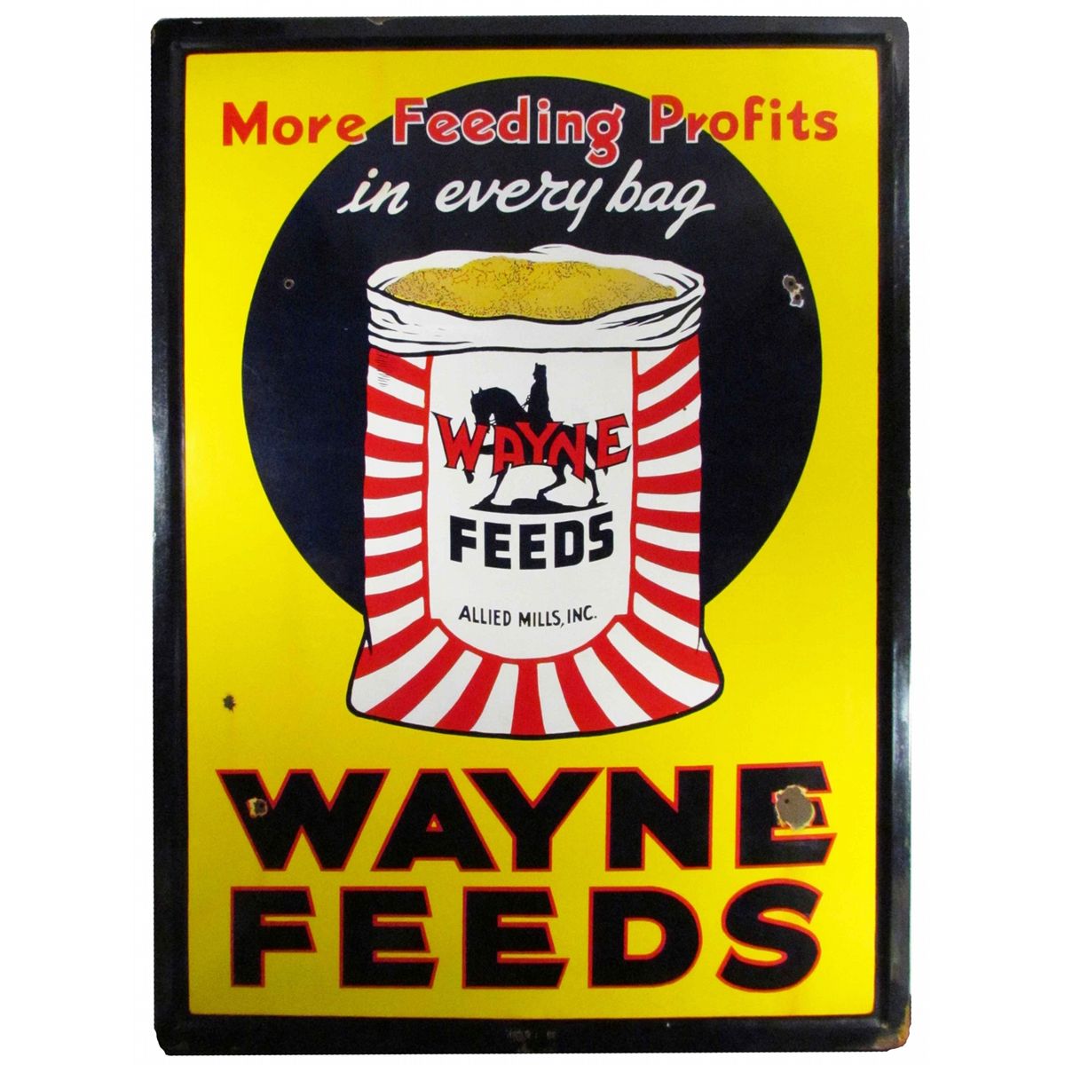 Wayne Feeds self framed porcelain sign. A few unubtrusive chips otherwise excellent condition. 36 X 46 inches.