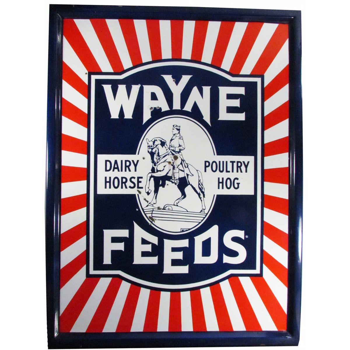 Wayne Feeds self framed porcelain sign. Chips in center cameo and a couple other small chips, otherwise excellent condition. 36 X 46 inches.