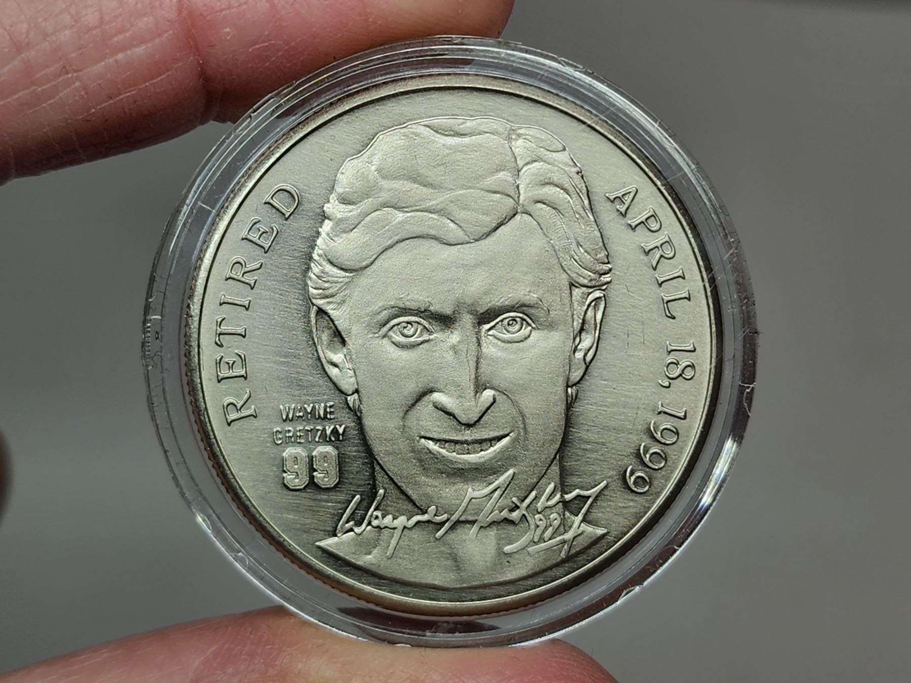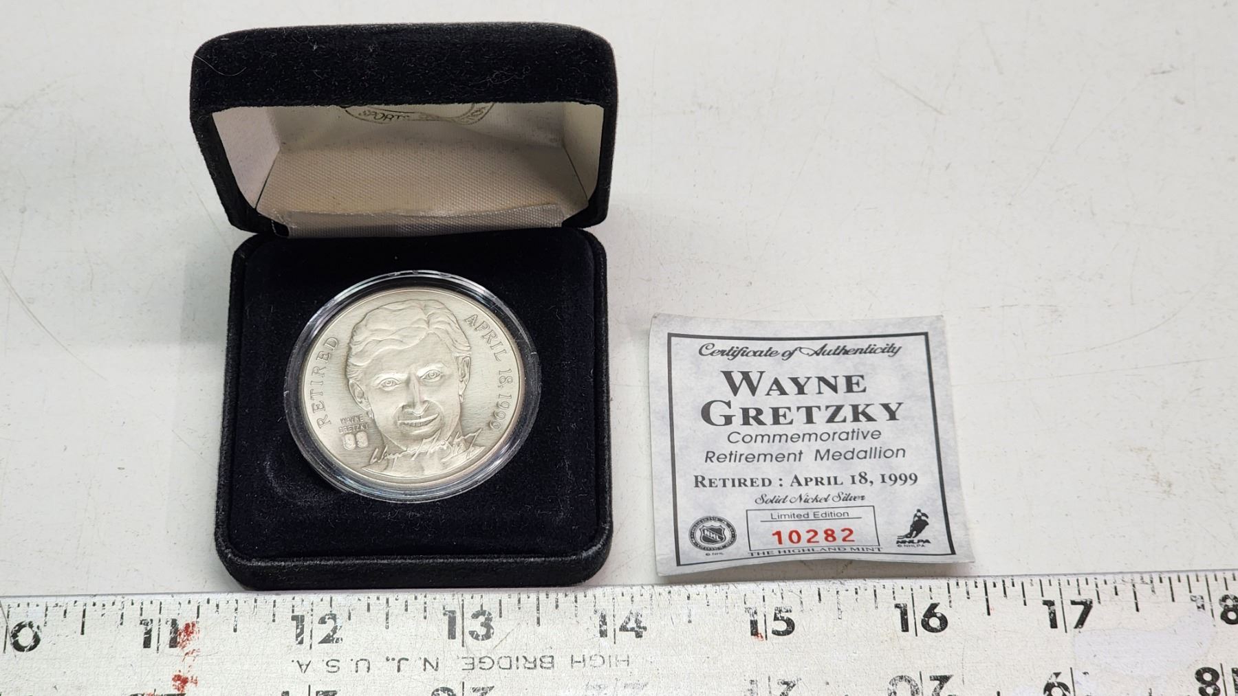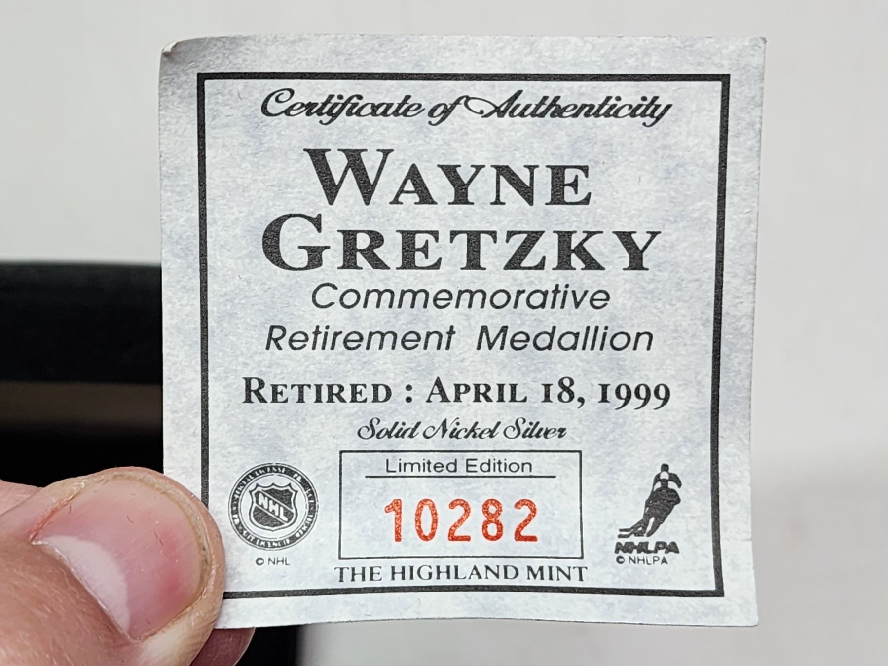 Wayne Gretzky Commemorative Retirement Medallion. Retired April 18, 1999. Housed in its original case of issue.