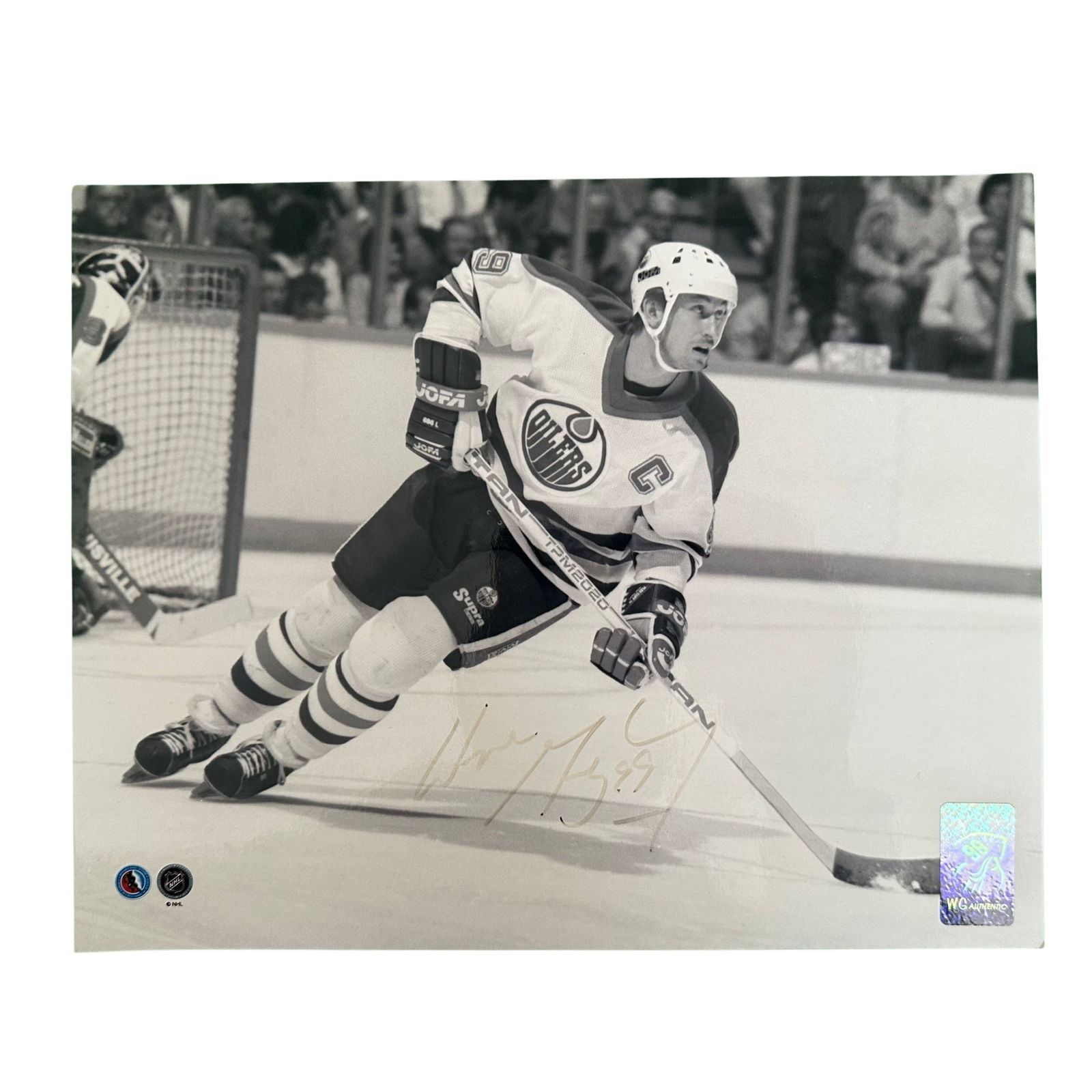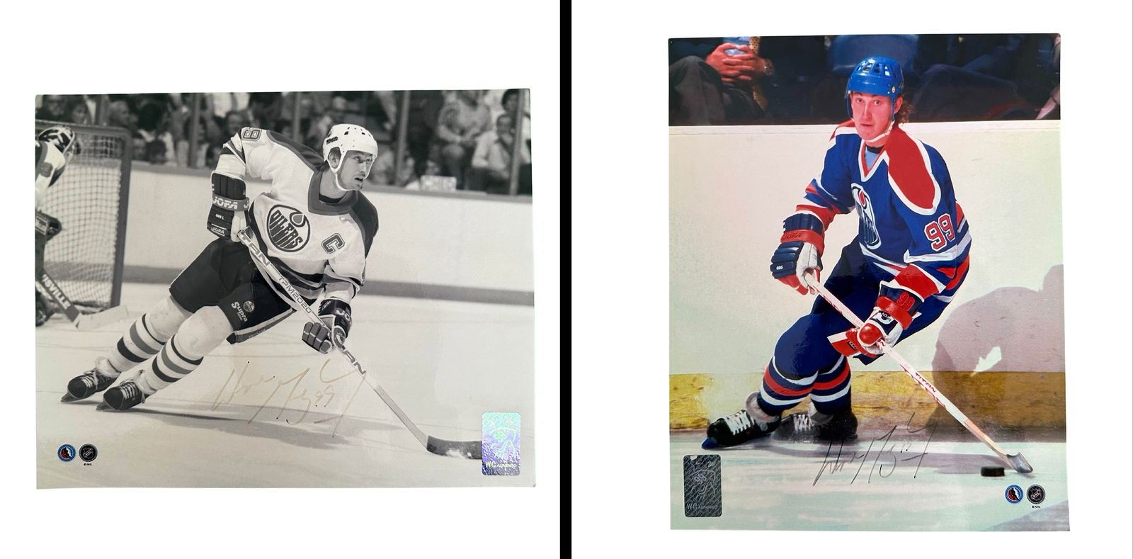 A pair of autographed photographs of Wayne Gretzky when he played for the Edmonton Oilers. Both include a WG Authentic hologram of authenticity on each piece. Signatures somewhat faded.