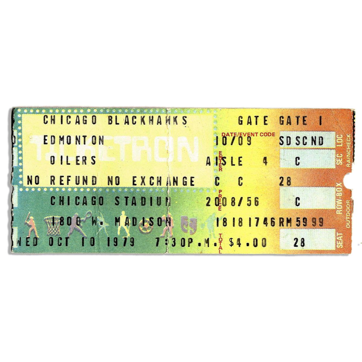 Fantastic and rare ticket to Wayne Gretzky's rookie NHL game with the Edmonton Oilers, dated 10 October 1979. During the game against the Chicago Blackhawks, Gretzky got his first assist when he helped set up Kevin Lowe for the first goal in Edmonton Oilers history. Ticket (missing stub) measures 4.5'' x 2'' with a crease running down the middle. Very good condition.