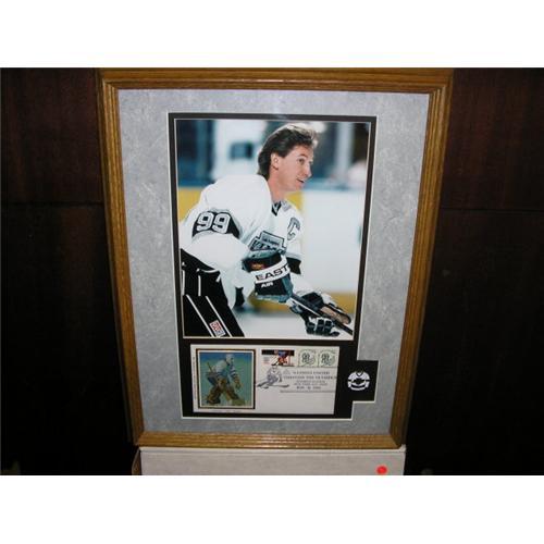 Framed picture of Los Angeles Kings Wayne Gretzky with a first day issue envelope, Nations United Through the Olympics Interpex Station New York, N.Y. 100023 March 6,1980. Official ASDA Cover- Interpex '80, Colorano "Silk" Cachet. There is a usa 15 cent postage stamp of a hockey player and two stamps that read the ability to write a root of democracy, they are usa 1 cent stamps and have a picture of an ink well and a father pen. There is a Small kings pin. inside this frame. This frame is wood and has a gray matting with a black matting under that. This picture is in excellent conditon.