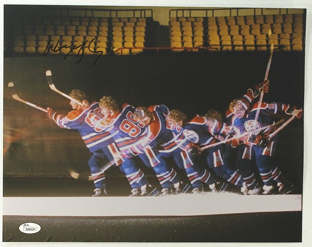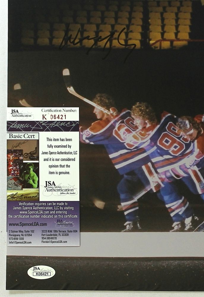 Photo measures 11" x 14" in size and has been hand-signed in black felt-tip pen by Wayne Gretzky (HOF). The autograph includes an official James Spence Authentication (JSA) hologram and matching COA for authenticity purposes.