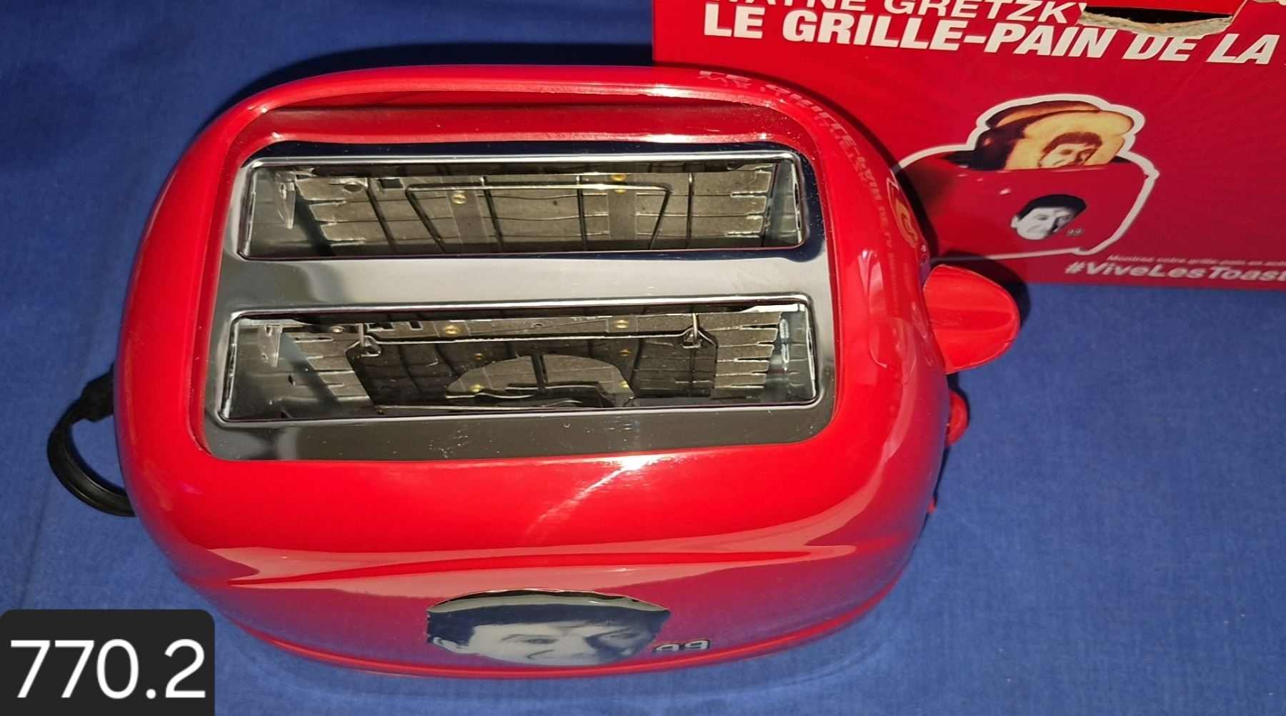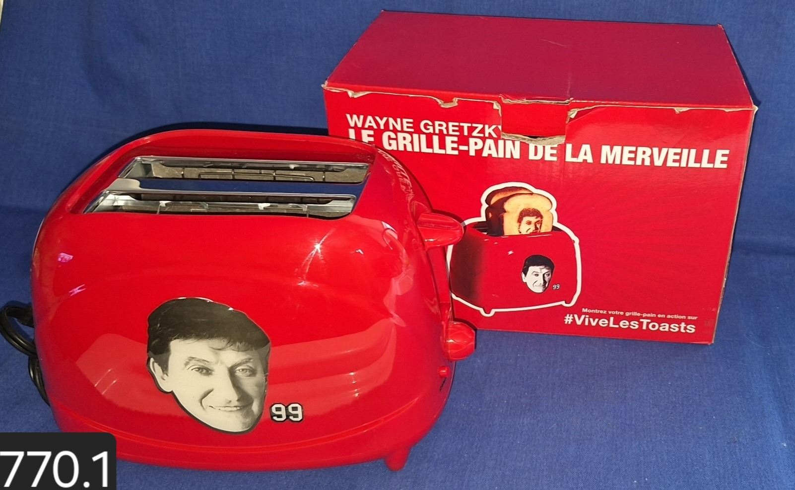 Wayne Gretzky toaster, new in box, metal profile of Gretzky's face, with cutouts, inside toaster, so a profile of Gretzky is toasted onto the slice of toast. Unique item.