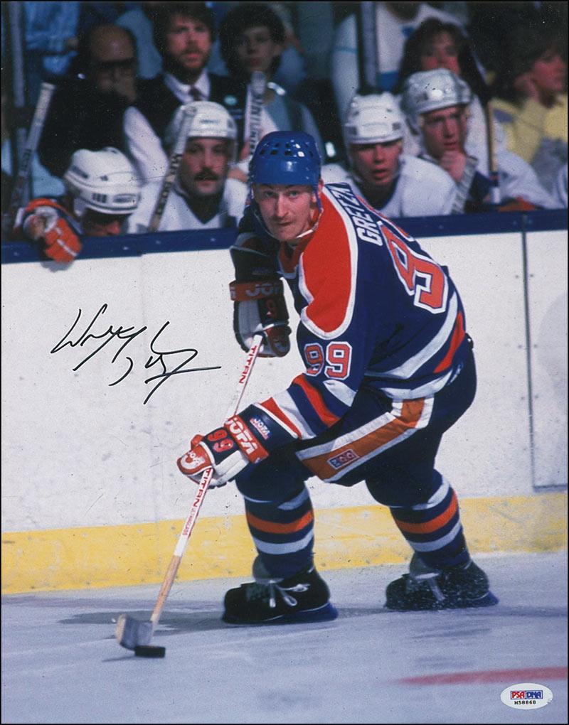 Color satin-finish 11 x 14 photo of Gretzky on the ice with the Oilers, signed in black felt tip. In very fine condition, with a PSA/DNA authentication label affixed to lower corner. Accompanied by a certificate of authenticity from PSA/DNA.