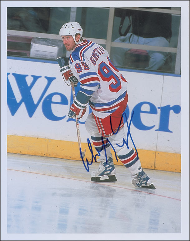 Color satin-finish 11 x 14 photo of Gretzky on the ice as a member of the NY Rangers, signed in-person in blue felt tip. In fine condition.
