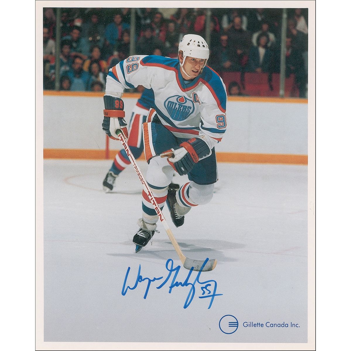 Color 8 x 10 promotional cardstock photo of Gretzky with the Edmonton Oilers, signed in blue felt tip. In very fine condition.