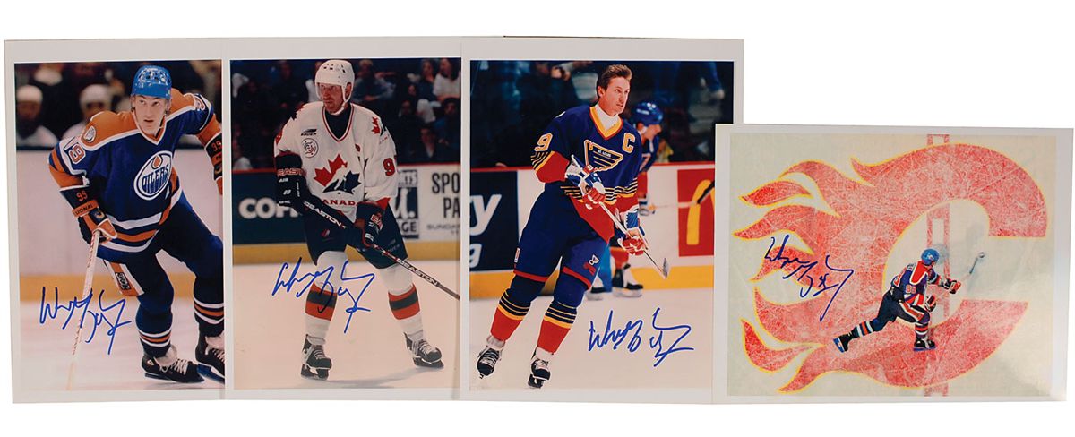 Four signed color photos, three glossy 8.5 x 11 and one 11 x 8.5 laserprint, of Gretzky in various uniforms, each signed in blue felt tip. In fine condition.