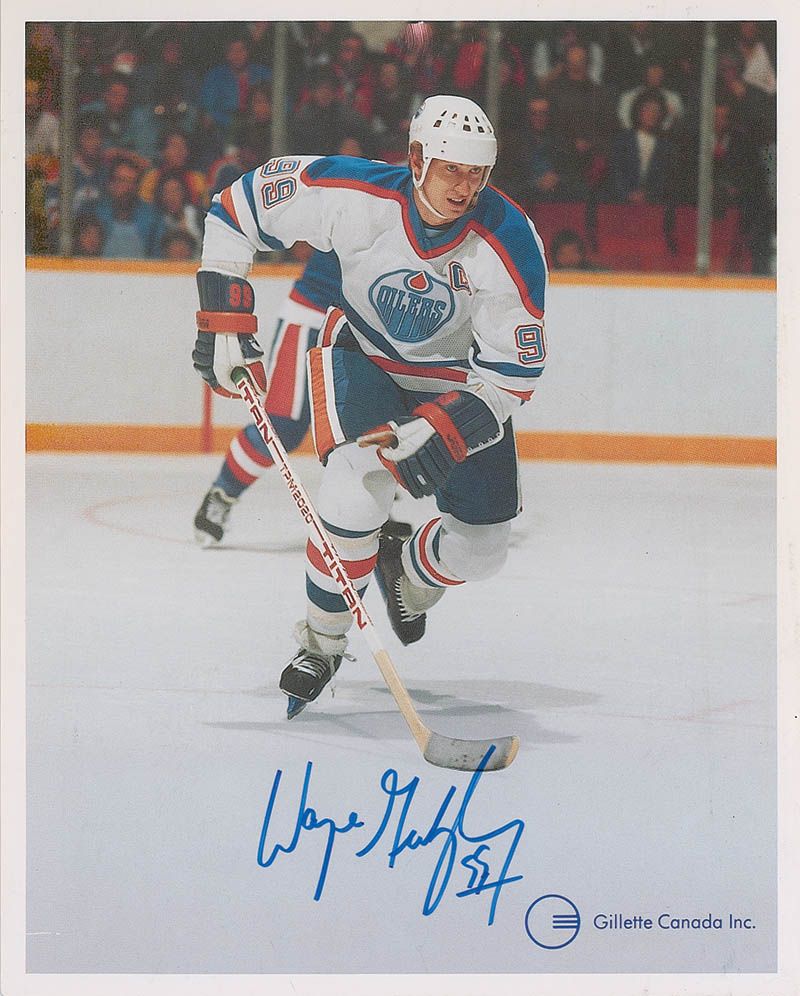 Color 8 x 10 cardstock Gillette promotional photo of Gretzky on the ice for the Oilers, signed in blue felt tip. In fine condition.