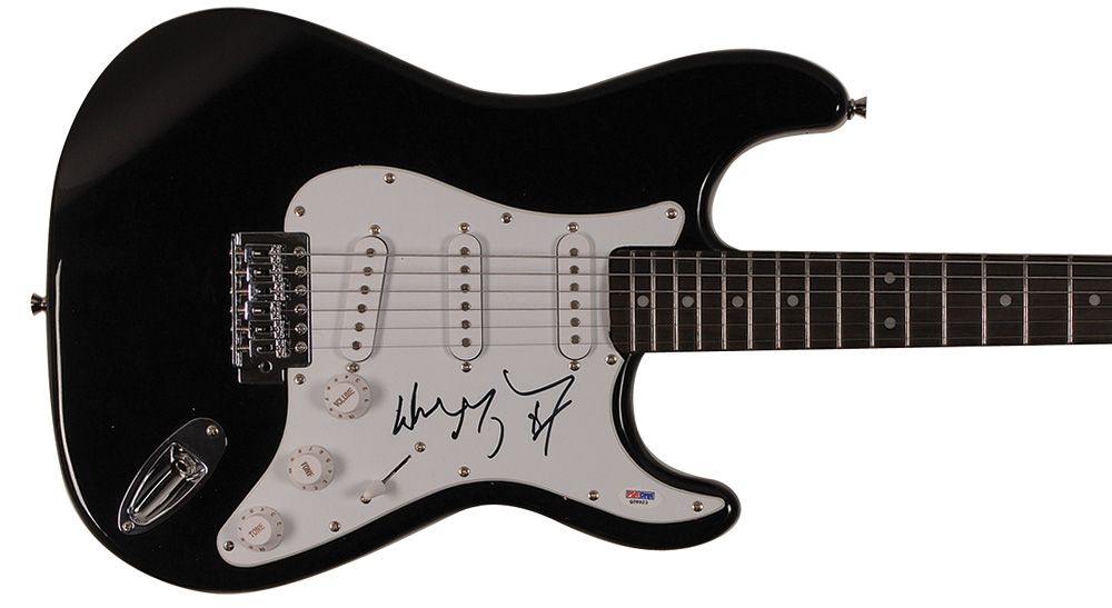 Black-bodied Stedman Pro ‘stratocaster-style’ electric guitar, nicely signed on the white pickguard in black felt tip. In fine condition, with a PSA/DNA authentication label affixed to pickguard. Accompanied by a certificate of authenticity from PSA/DNA. Oversized.