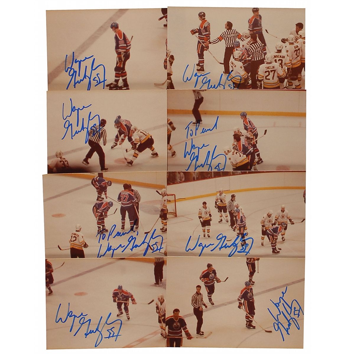 Eight color satin-finish 5.25 x 3.5 snapshot photos of Gretzky with the Oilers, each signed in blue felt tip, with two inscribed to “Paul.” In overall fine condition.