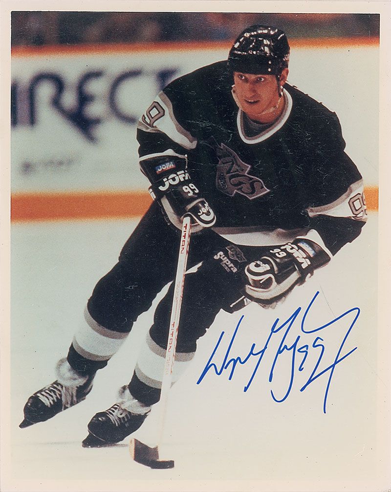 Color glossy 8 x 10 photo of Gretzky on the ice with the Los Angeles Kings, signed in person in blue felt tip. Scattered surface marks and spotting, otherwise fine condition. Originally obtained by in-person specialist Mike Wehrmann.