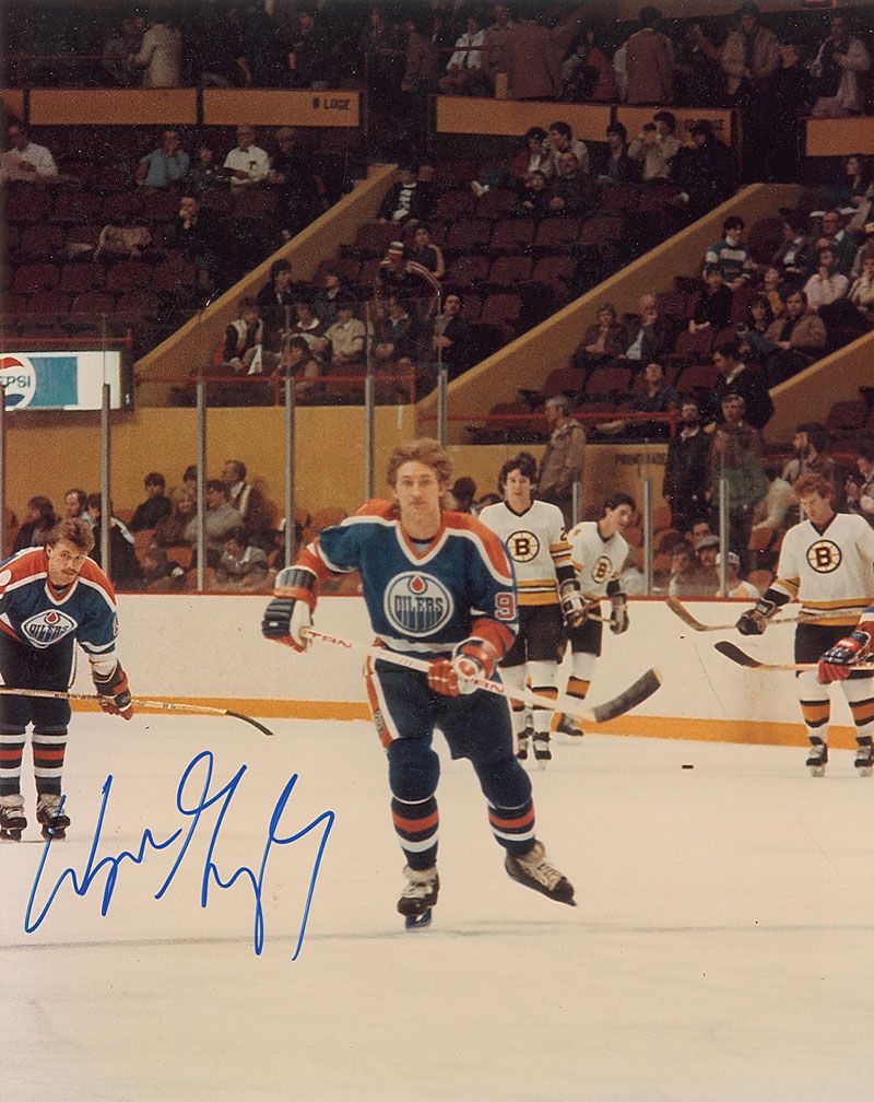 Color satin-finish 8 x 10 photo of Gretzky on the ice while with the Oilers, signed in blue felt tip. In fine condition.