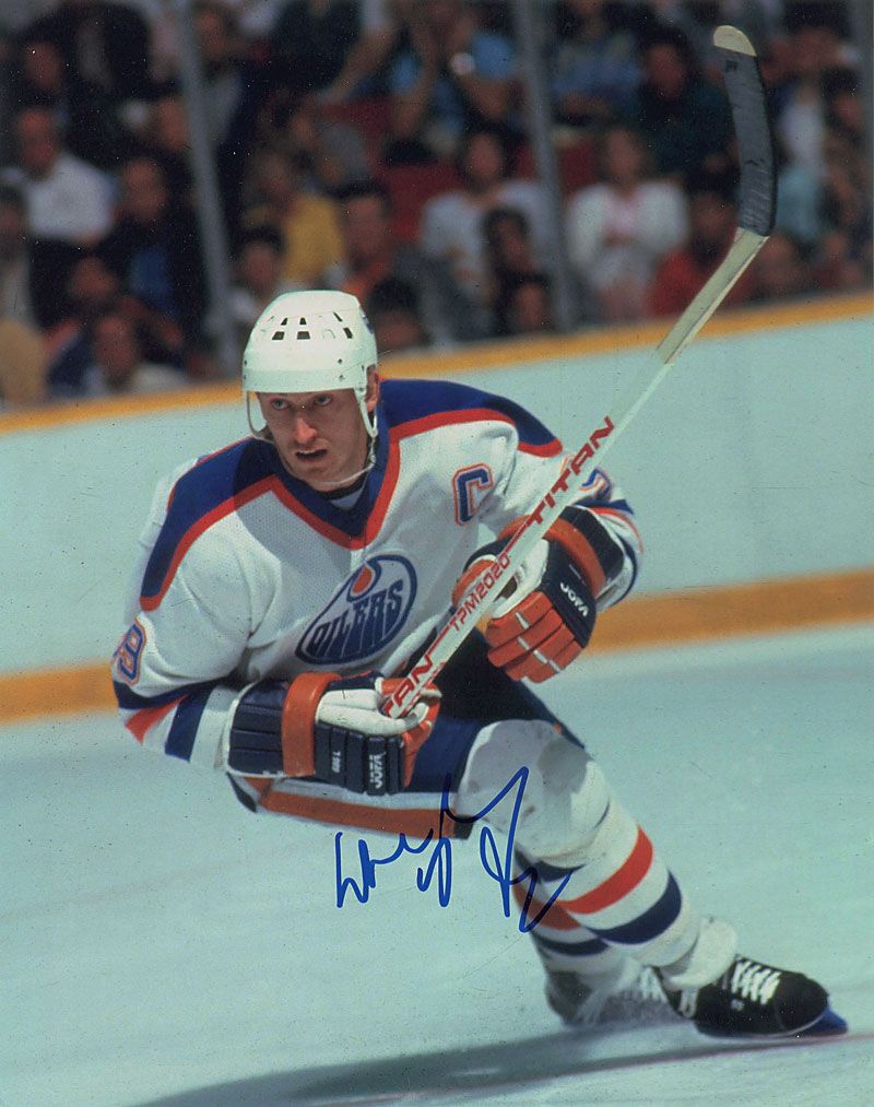 Color satin-finish 11 x 14 photo of Gretzky on the ice for the Oilers, signed in person in blue felt tip. In very fine condition. Originally obtained by in-person specialist Mike Wehrmann.