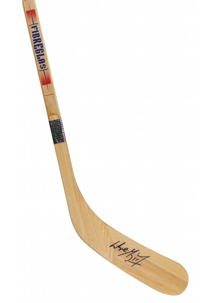 Official Hespeler Gretzky-model hockey stick signed in blue felt tip on the blade. In fine condition. Oversized.